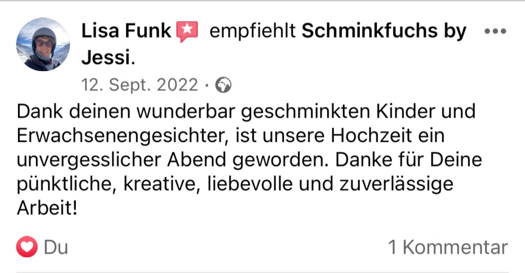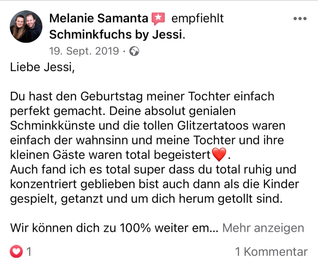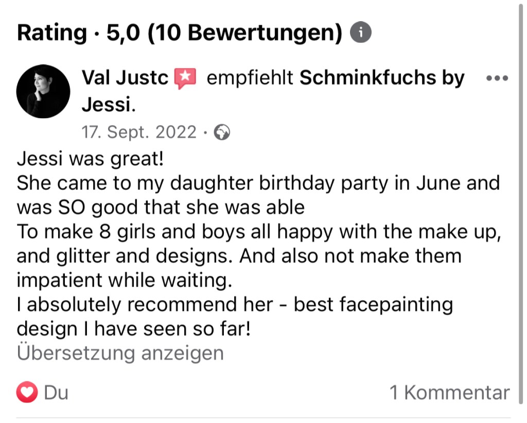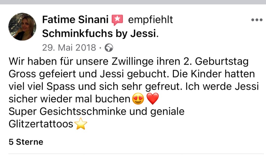 vielen Dank für deinen Einsatz bei unserem Kindergeburtstag! Alle Kids waren super klasse geschminkt und mega happy… auch die Glitzertattoos kamen wahnsinnig gut an… Es hat uns sehr gefreut dich hier gehabt zu haben.