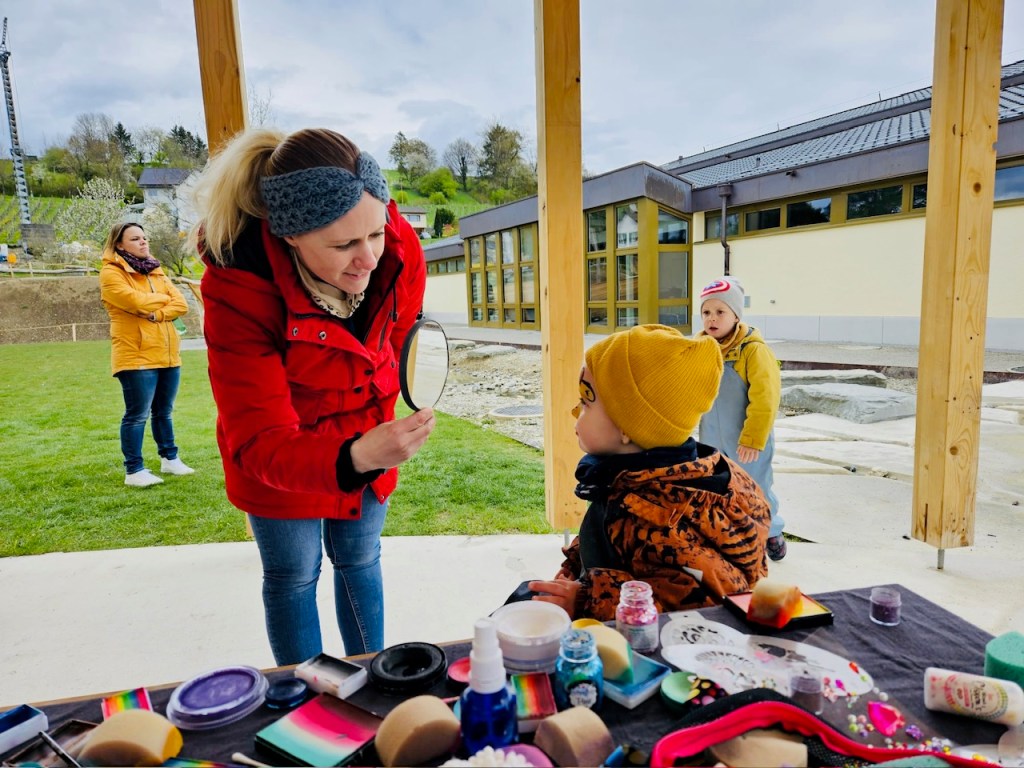Kostenloses Kinderschminken bei der Eröffnung der Freizeitanlage (neuer Spielplatz) in Dachsen am Samstag, den 15. April 2023.