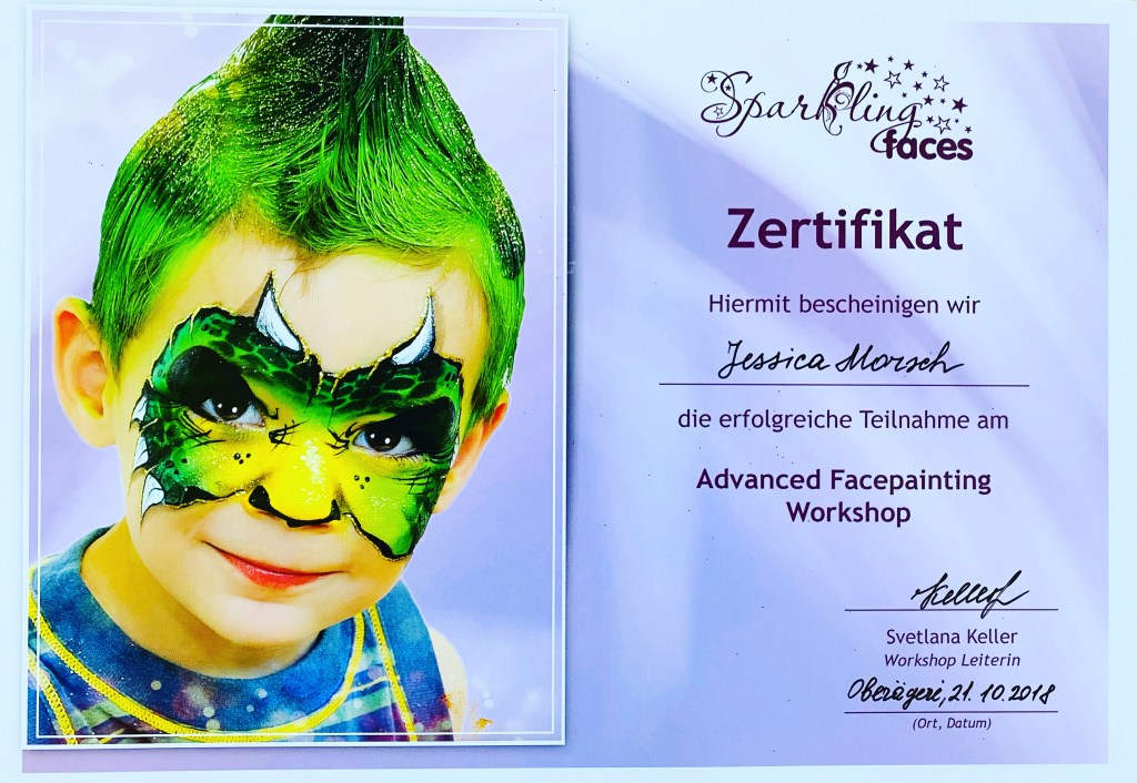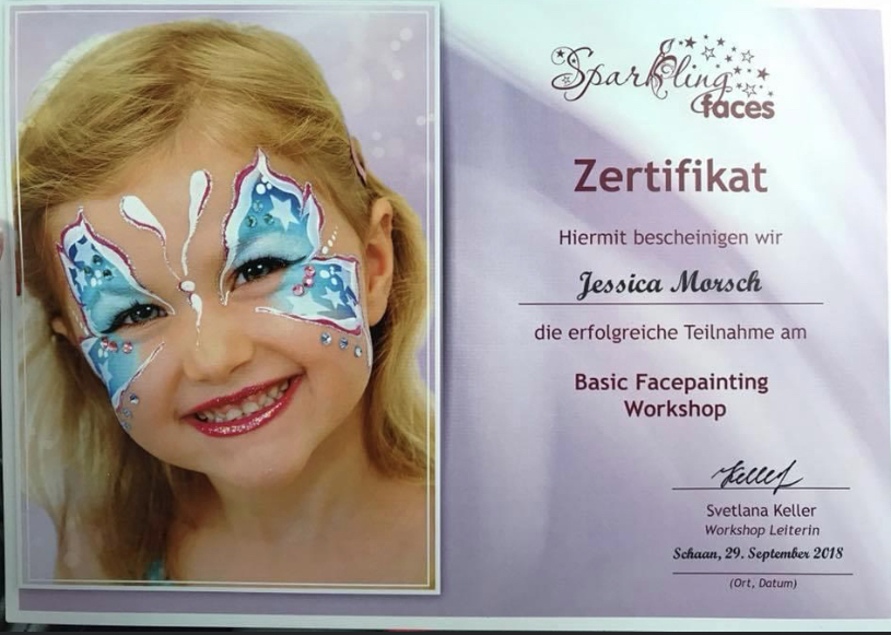 Um das ganze professionell auszuüben, habe ich an mehreren Facepaint Workshops und Kursen teilgenommen und habe von den besten gelernt. Denn professionelles Kinderschminken ist mein Anspruch. Daher darf ich mich auch als -zertifizierte professionelle Facepaint Artistin- bezeichnen.